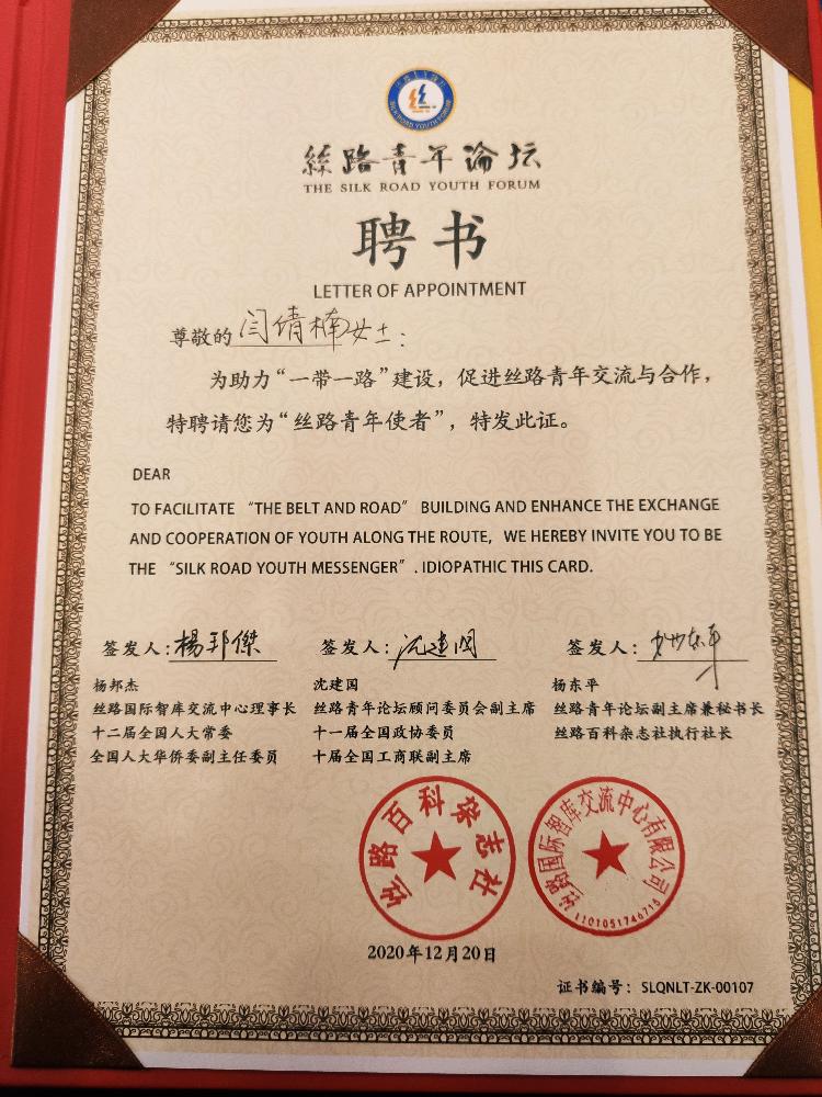 我院国际合作办公室闫倩楠老师荣获“丝路青年使者”证书