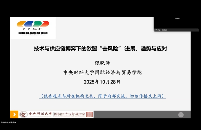 张晓涛(中央财经大学国际经济与贸易学院院长、教授)做了题为《技术与供应链博弈下的欧盟“去风险”:进展、趋势与应对》的专题报告: