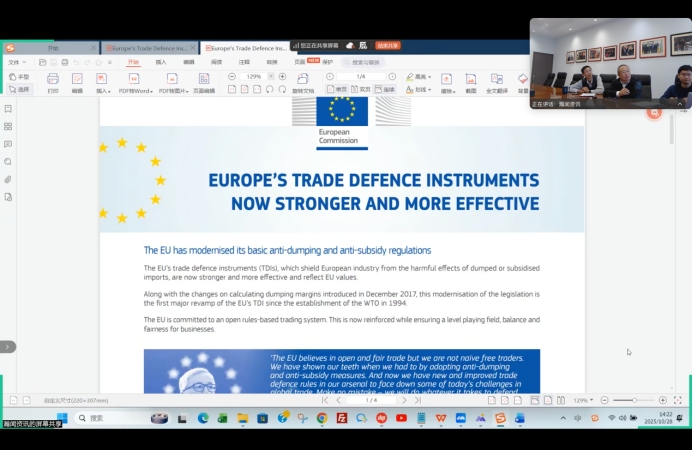 童友俊董事长从思想根源、理论逻辑、政策措施、实施工具等层面,具体分析了欧盟提出的“贸易防卫“政策,他指出,欧盟的贸易防卫政策日益被 “经济安全” 的逻辑所驱动。将供应链韧性、技术泄露等定义为核心风险,贸易政策因而成为服务其地缘政治目标、降低对外依赖的战略工具,呈现出鲜明的 “地缘经济转向”;欧盟更擅长构建一种政治叙事,为其干预措施提供合法性。例如,通过反复强调中国的 “产能过剩” 和 “不公平补贴”,将复杂的经济模式差异塑造为一种对立的威胁。这种 “中国威胁”叙事,与它自身为本土产业提供巨额补贴(如《净零工业法案》)的行为形成双重标准,本质上是将产业政策伪装成对“公平竞争”的追求。欧盟构建了一套超越WTO规则的新一代单边政策工具库 。其《外国补贴条例》(FSR)可审查在欧运营的外国企业;《国际采购工具》(IPI)能以市场准入不对等为由限制他国企业参与欧盟公共采购;《碳边境调节机制》(CBAM)则实质构成了新型绿色贸易壁垒。这些工具相互联动,赋予欧盟对其市场前所未有的精细化控制权。其行动更具主动性和进攻性,不仅调查发起频繁、覆盖行业广泛,还率先动用IPI等工具对中国医疗设备施加采购禁令。这种先发制人的风格,旨在通过强势行动为自身产业争夺优势和转型空间。