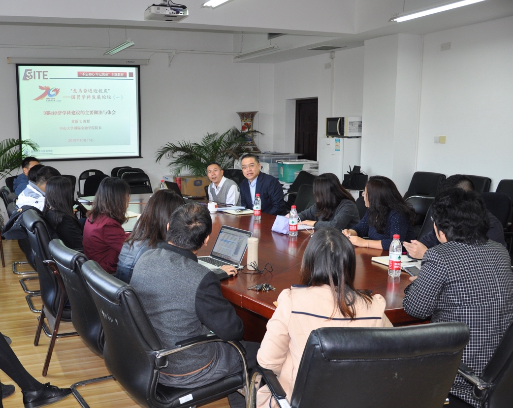 为庆祝学校建校70周年,扎实推进“不忘初心、牢记使命”主题教育,促进学院学科发展,2019年10月15日下午,国际经济与贸易学院在学院南路校区主教学楼702会议室举行“不忘初心、牢记使命”主题教育学科建设经验交流会,中山大学国际金融学院院长黄新飞教授应邀来我院交流人才培养与学科建设经验。交流会由院长张晓涛教授主持,院党委书记徐淼,副院长李瑞琴、王立勇教授,各系系主任、教师以及相关科室老师等20余人参加了交流活动。
