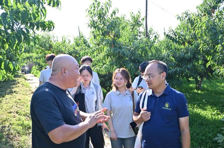 最后,调研团队对仙人洞村的种植业进行了考察。依托明朝时种植祭祀果品的永陵园文化,该村打造出了仙人贡果“黄金蜜桃”品牌,这些黄金蜜桃以其优良的品质、独特的果香以及脆甜的口感赢得了市场的广泛认可。据村内一位种植户介绍,他的富硒黄金蜜桃果园种植面积超过五百亩,年总产量超过四千公斤。种植过程中不施化肥不打农药,采用酵素灌溉,结出的黄金蜜桃果型大而饱满、桃香浓郁、脆甜多汁,每年都有来自天南海北的顾客向他订购几十甚至上百斤的蜜桃,收入可以达十万元以上。