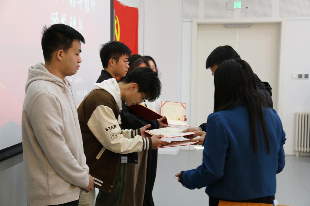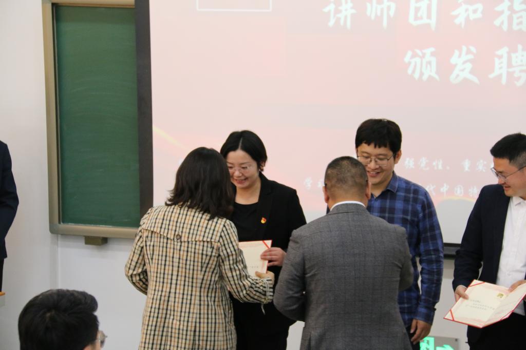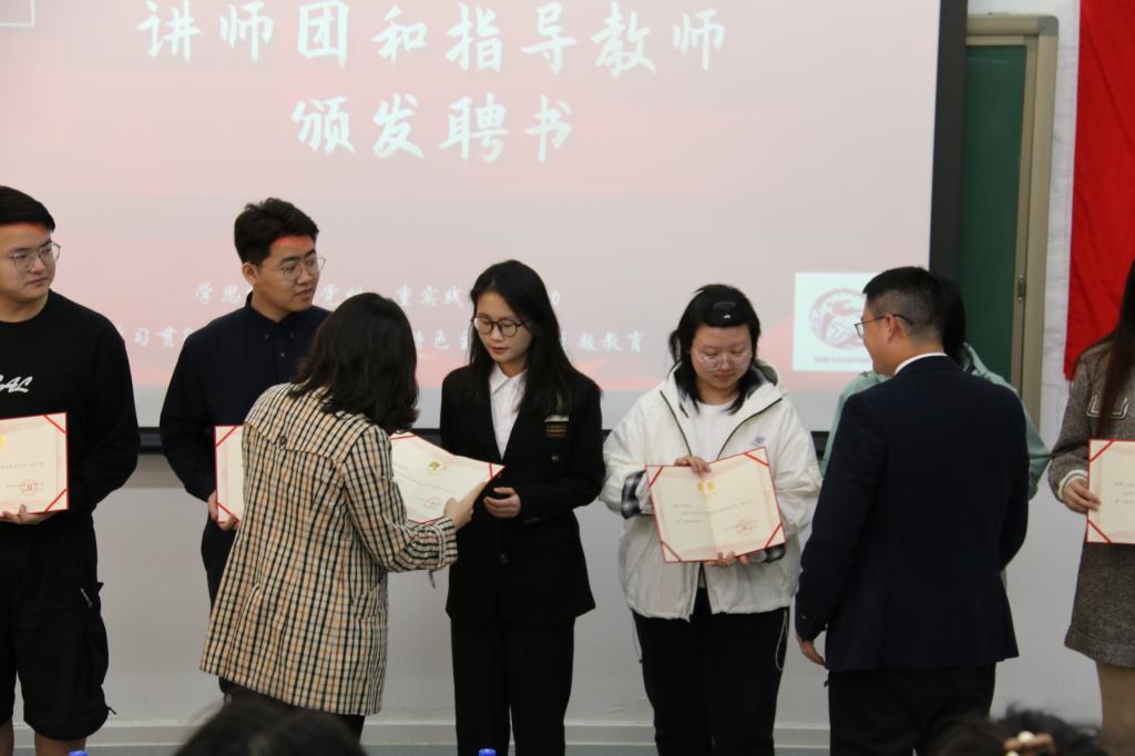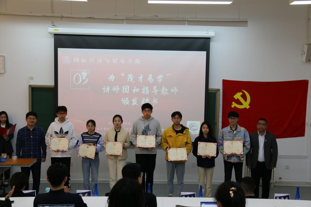 接着,学院党委副书记杨武在大会上宣读国际经济与贸易学院党委〔2023〕1号文件,经学院党委2023年度第九次党委会议研究决定:以“红摇篮”学生党建工作基地为依托,成立“茂才易学”讲师团,聘任文思琪等30名学生为“茂才易学”第一期讲师团成员;聘任苗壮、钟腾龙、俞脱脱、蒋海威4名教师为“茂才易学”讲师团指导老师。与会领导、老师为“茂才易学”讲师团成员和指导教师颁发了聘书。