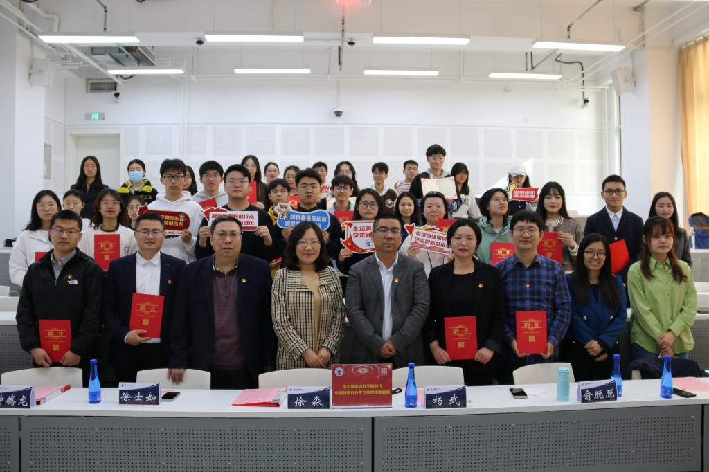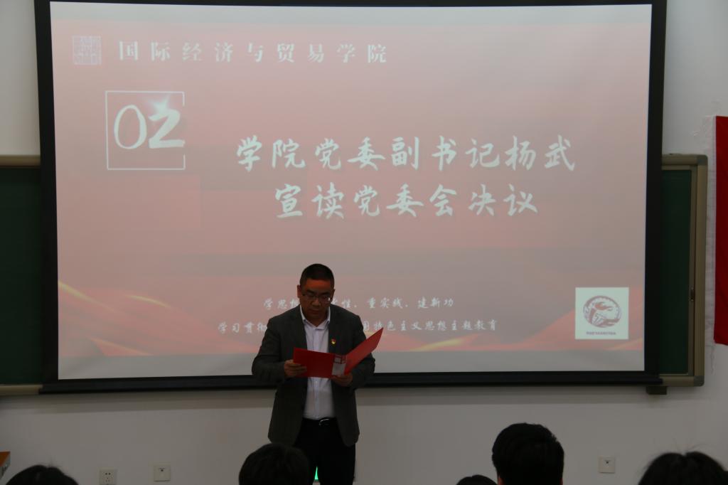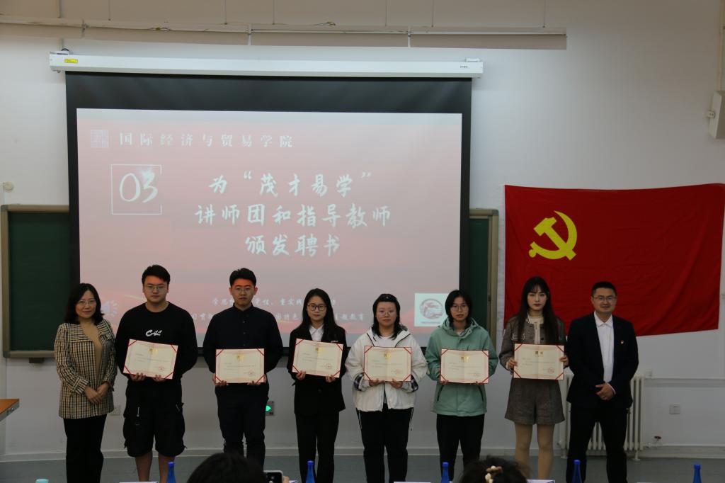 为学习贯彻习近平新时代中国特色社会主义思想主题教育, 弘扬“五四”爱国主义精神,传承中财红色财经文化,4月26日,国际经济与贸易学院党委在二教100教室召开了“茂才易学”讲师团成立大会,院党委书记徐淼、院党委副书记杨武、院党委组织员徐士如、国际经济与贸易本科生党支部钟腾龙、国际贸易系教工党支部苗壮、国际商务系教工党支部俞脱脱、国际商务系教工党支部蒋海威、学院党委秘书、“红摇篮”党建工作基地负责老师邱小花、“红摇篮”党建工作基地全体干事和学院进步青年代表出席本次成立大会。大会由学院“红摇篮”学生党建工作基地党务工作部杨博新、王丹妮主持。