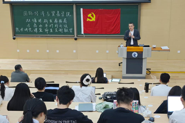 为深入贯彻中央八项规定精神学习教育,持续深化党风廉政建设与作风建设,深刻剖析双循环新发展格局与高水平对外开放的内在逻辑,系统探索其在新时代背景下的实践路径,切实提升师生党员对国家经济战略的理解与践行能力,2025年6月3日上午,国际经济与贸易学院党委在学院楼13号楼125教室开展了“院长讲党课”暨师生支部联学活动。院长张晓涛教授作了题为《双循环新发展格局与高水平对外开放》的专题报告。学院党委组织员徐士如、国际贸易学硕士研究生党支部、国际商务专业硕士研究生党支部全体党员参加了本次活动。会议由国际商务专业硕士党支部书记李庆娜主持。